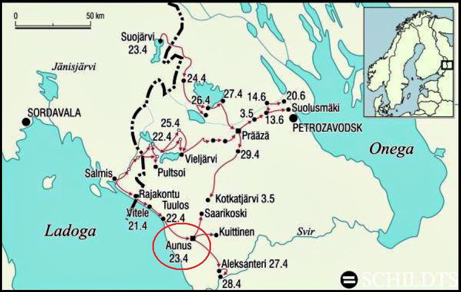 Aunus, which is Finnish for Olonets, was the administrative center of the Olonetsky District of Karelia (Eastern Karelia). Soon after Finland gained independence from the Russians, the citizens of Karelia, which were culturally aligned with the Finns, began requesting support to join Finland. After a couple of unsuccessful forays, Finnish troops crossed into Eastern Karelia on 21 Apr, 1919 with the objective to unite Eastern Karelia with the rest of Finland. The Finns sorely underestimated the troops necessary to take Eastern Karelia, anticipating support from the local population as well as from British Troops which occupied portions of the region.