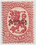 During the short occupation period, 8 denominations of the Finnish coat of arms stamps of 1917 were overprinted with “Aunus” in black. Two printings were made, the first on 27 Jun, 1919 and the second on 18 Aug, 1919. The stamps were issued by local authorities primarily to support the volunteer corps, and to provide moral support for their anticipated “independence”.
