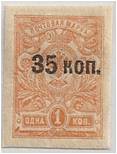In October, 1918, due to changes in postage rates, the Sulkevich government needed to issue 35 kopeck stamps for ordinary postage. Stocks of existing Russian 1 kop imperforate stamps, useless do the high inflation in Russia, were overprinted in black letters “35 KOP” in black by typography. A large quantity of these stamps were overprinted, and are still quite easily obtained by collectors.